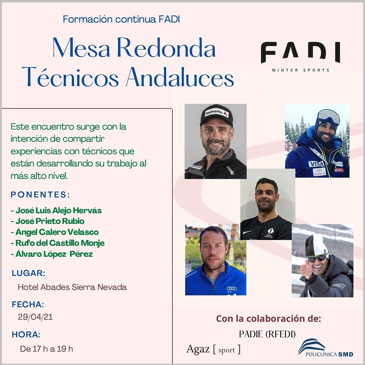 Con el apoyo del Plan PADIE Real Federación Española Deportes de Invierno y los colaboradores Grupo Agaz Abogados y Consultores y SMD Clinica, compartiremos jornadas en pista y una mesa redonda con técnicos Andaluces, donde se sumarán varios amigos que han estado en estructuras de equipos nacionales de varios países.