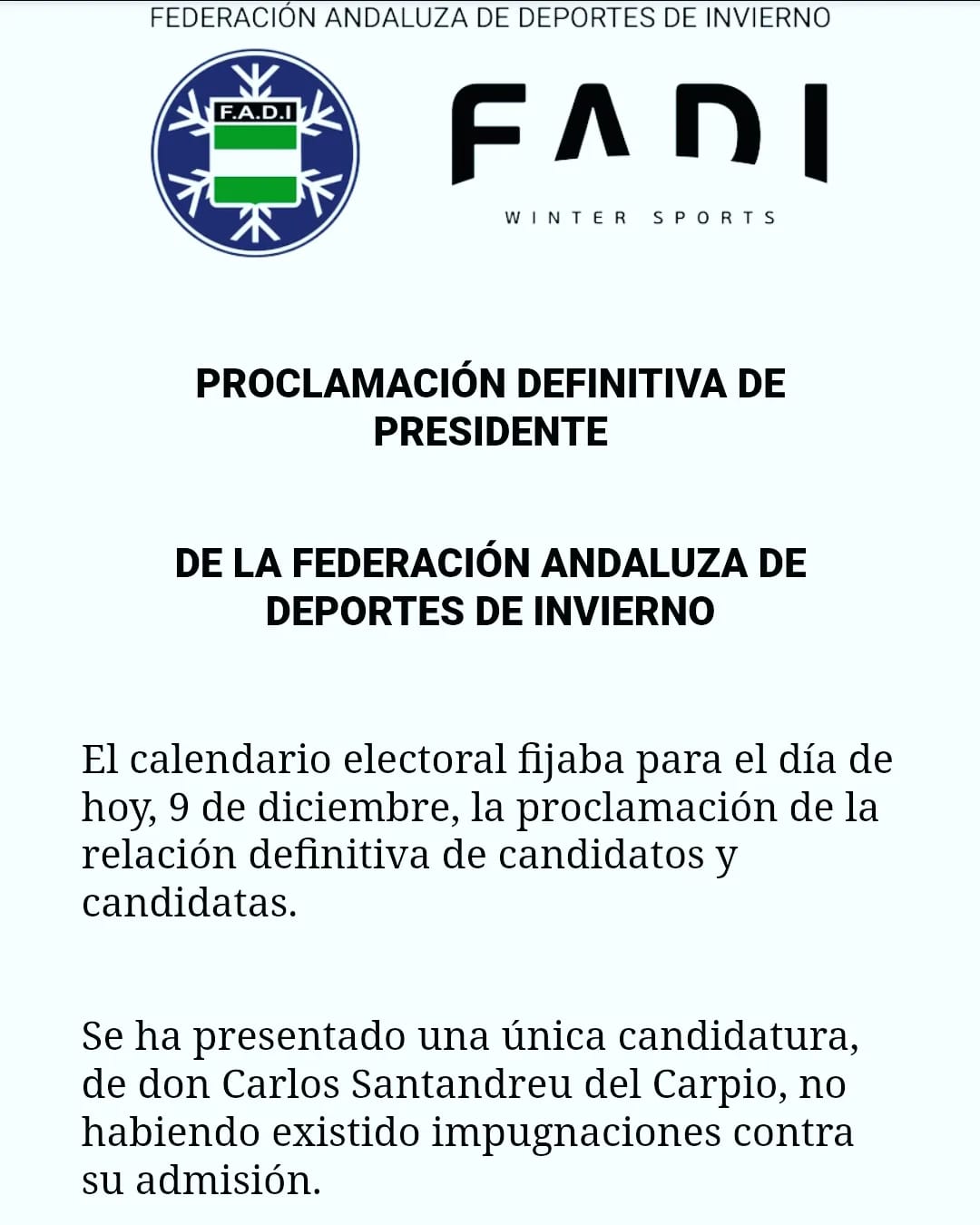 Carlos Santandreu del Carpio ha sido, en el día de hoy, ratificado como Presidente de la Federación Andaluza de deportes de invierno, tras el proceso electoral que ha llevado (sin concurrencia de otras candidaturas), a su reelección.