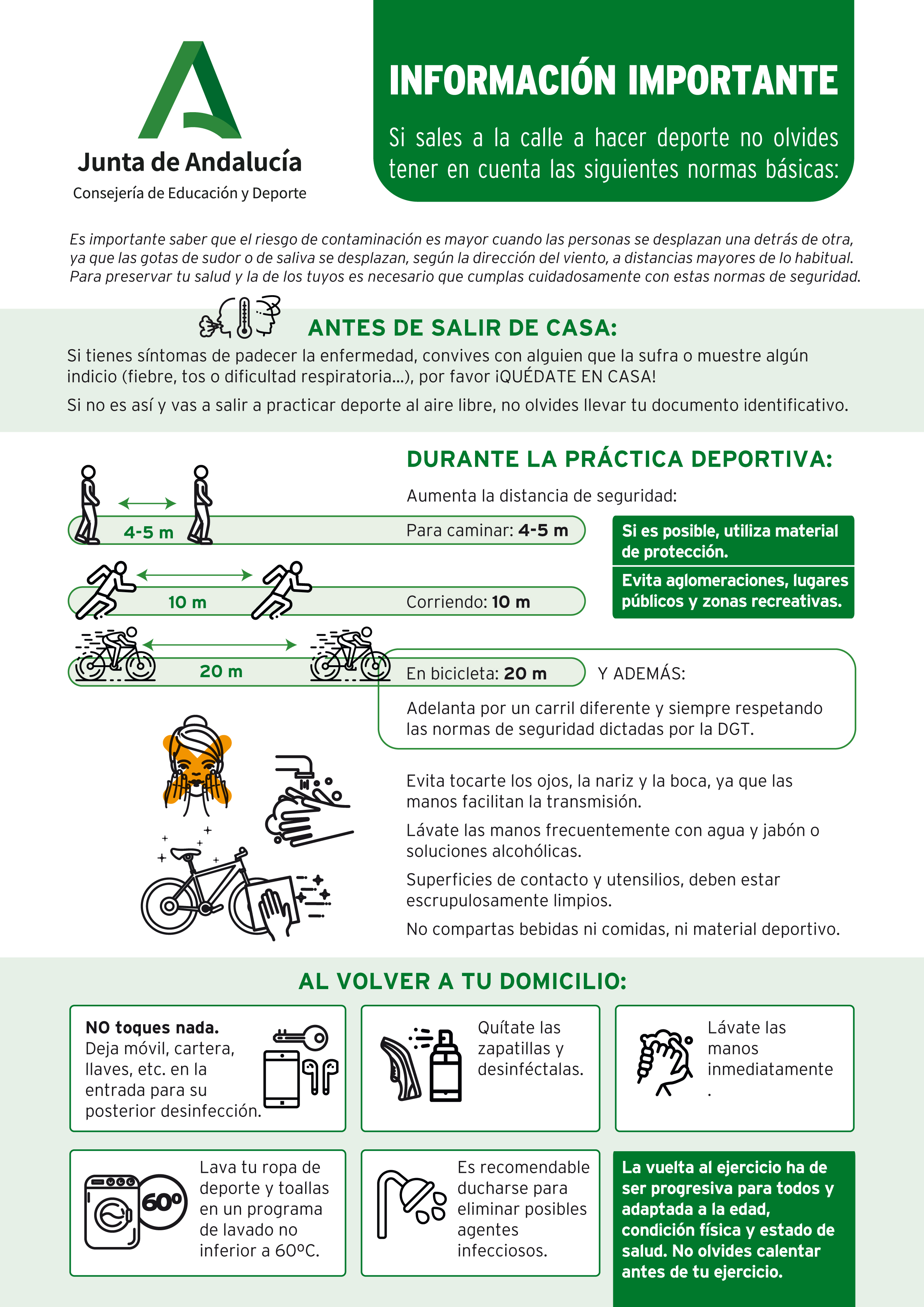 La Dirección General de Promoción Deportiva , Hábitos Saludables y Tejido Deportivo ha elaborado una infografía con indicaciones básicas para el ciudadano que va a salir a realizar ejercicio físico y deporte siguiendo las recomendaciones sanitarias.