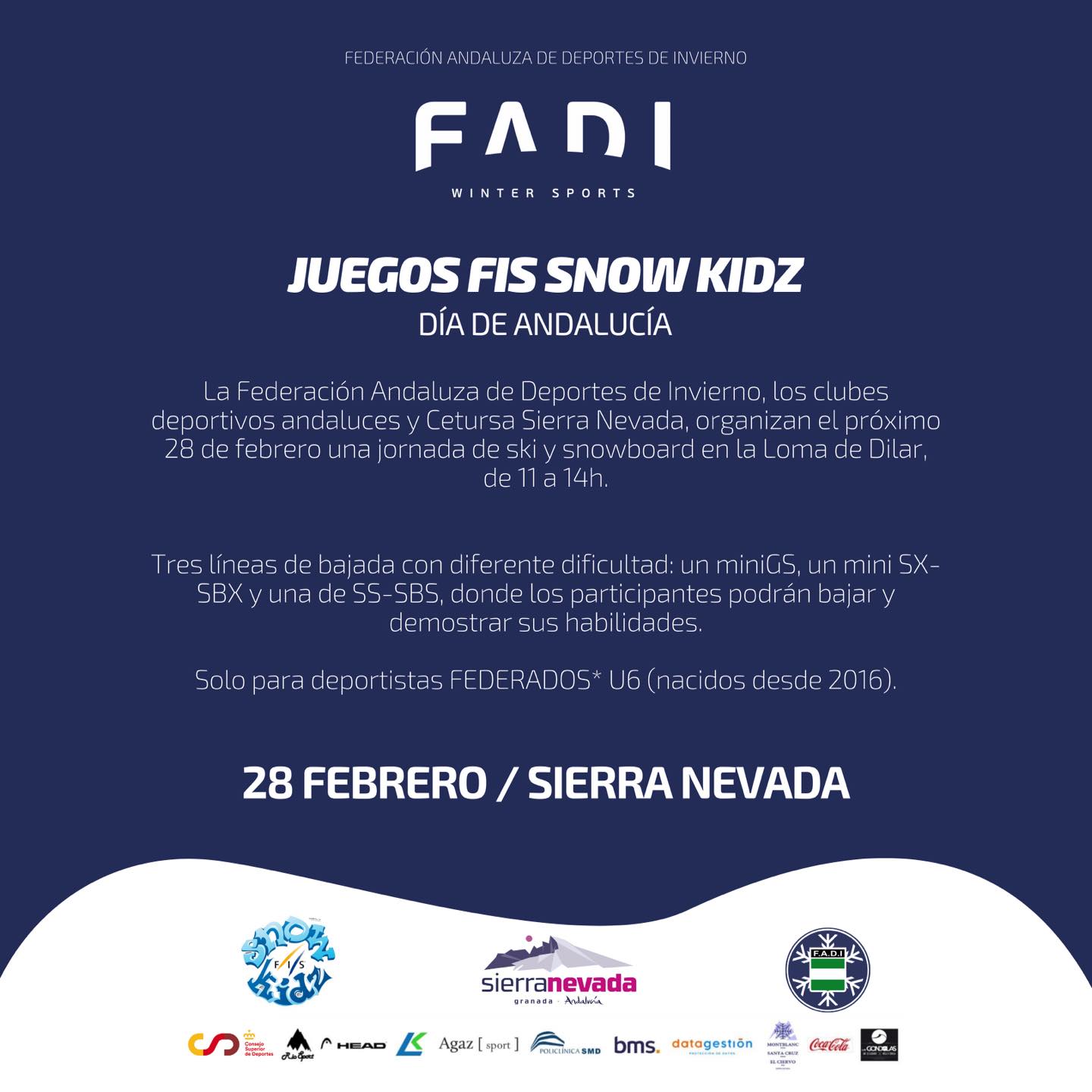 El próximo 28 de febrero, #DíadeAndalucía, @sierranevadaestacion celebra los juegos FIS SNOW KIDZ y estaremos ahí para apoyar a los más peques, que nos deleitarán con sus bajadas en La Loma de Dílar de 11:00h a 14:00h